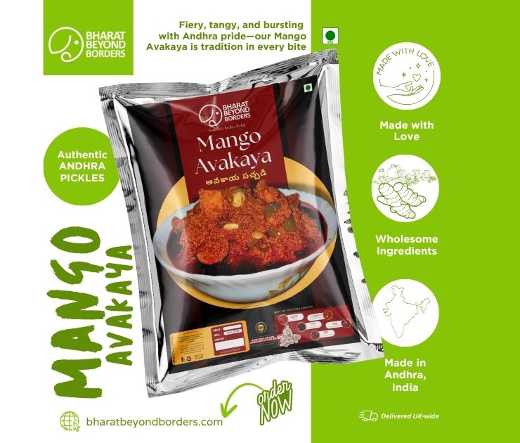 Taste the authentic flavour of Andhra Pradesh with our Mango Avakaya Pickle. Made from handpicked raw mangoes, mustard, and pure Indian spices, it’s bold, tangy, and preservative-free. A traditional favourite rich in natural goodness — now bringing a fiery, homemade touch to every UK kitchen.