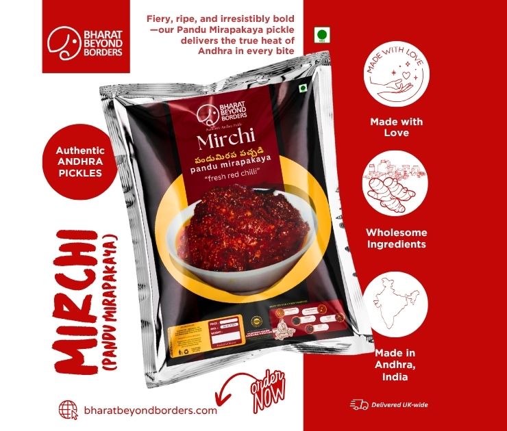 Enjoy the bold, spicy taste of Andhra Pradesh with our Mirchi Pickle. Made using fresh green chillies, traditional Indian spices, and natural oils, this pickle adds a fiery twist to any meal. Perfect for spice lovers in the UK.